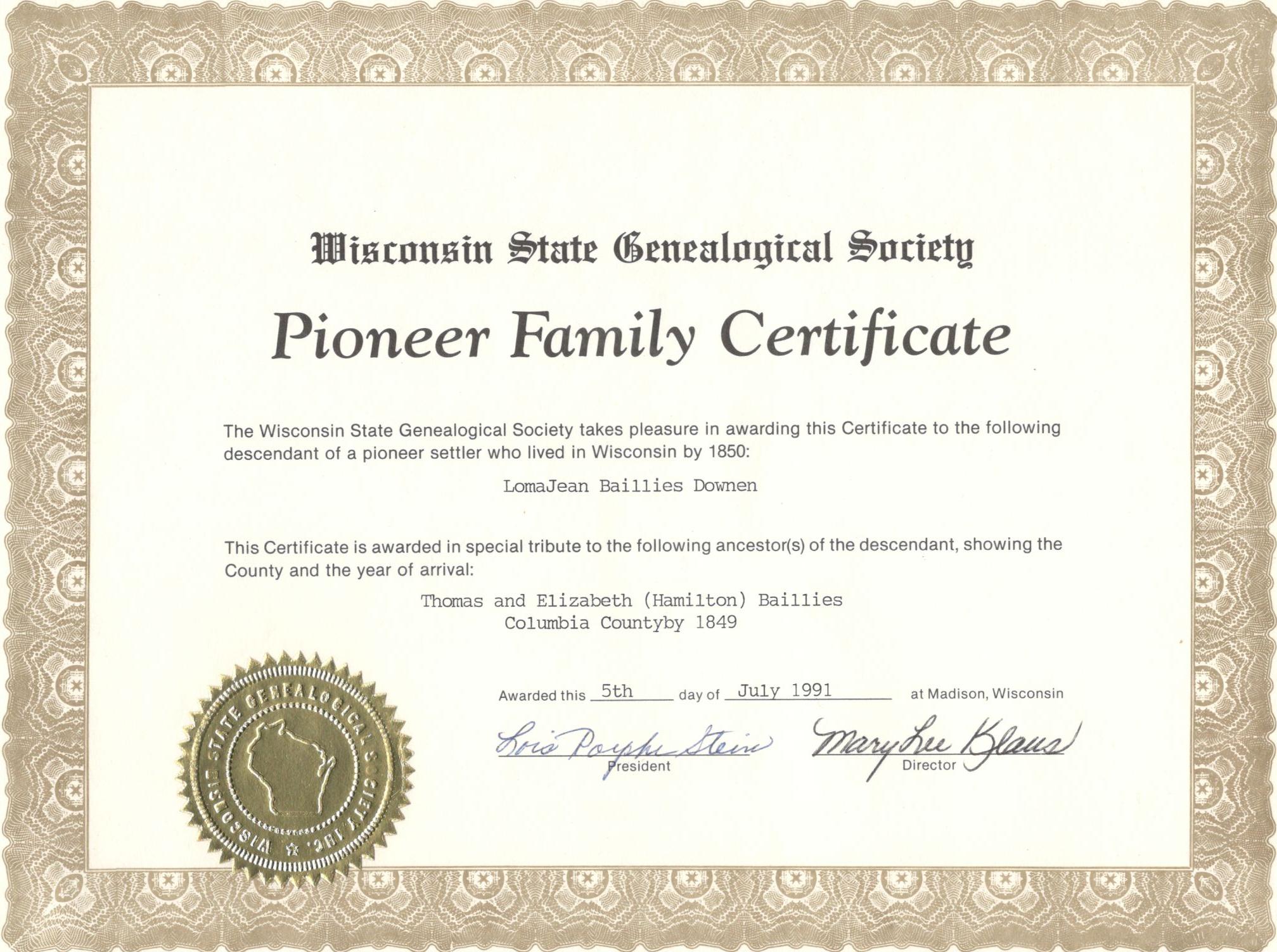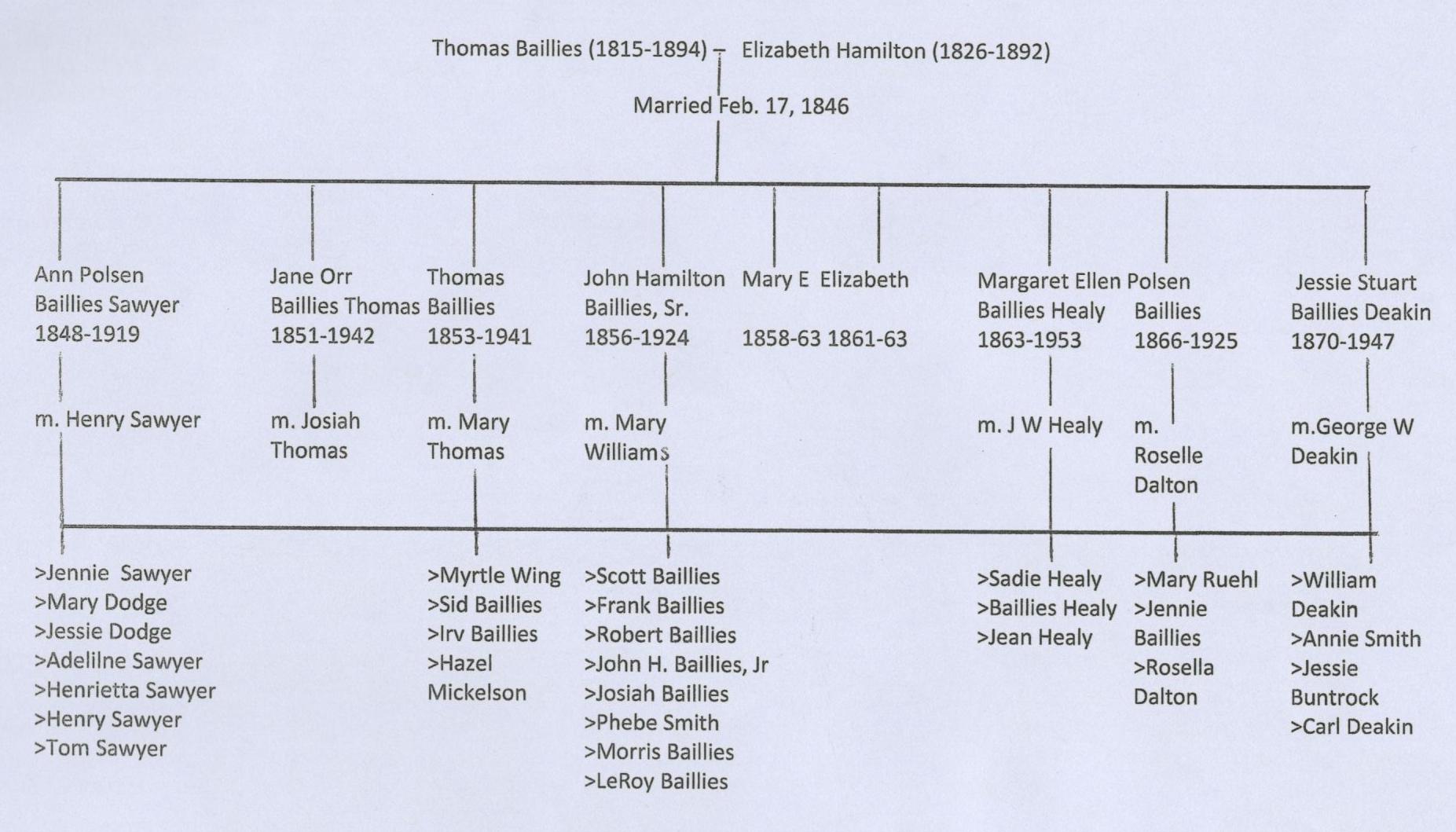 Seven of the nine children born to Thomas and Elizabeth Baillies grew to manhood and womanhood. These are the names and dates of the birth and