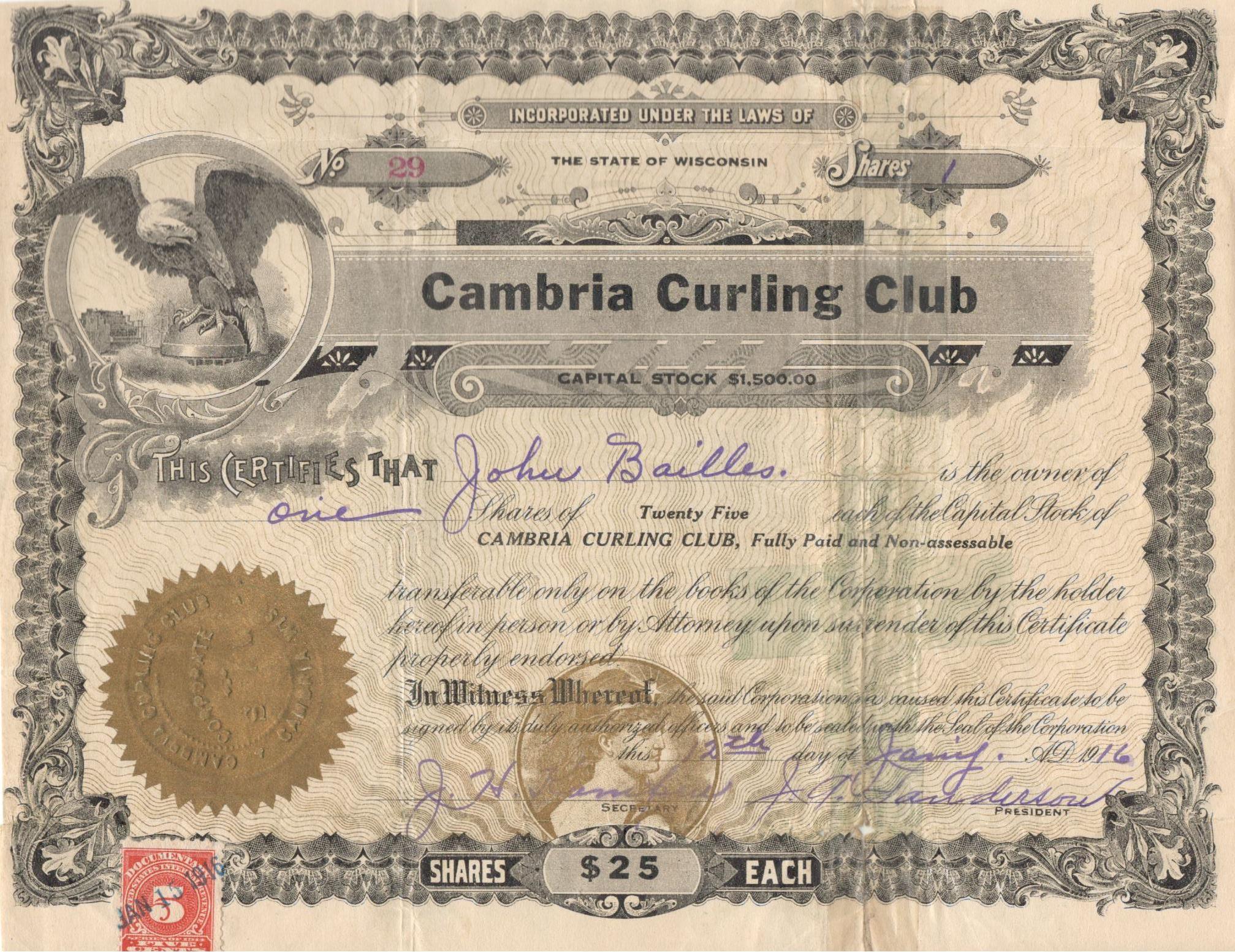 | Cambria Curling Club Stock Certificate | Jim Smith, Frank Baillies, Charles Smith, John Baillies, 1950 |